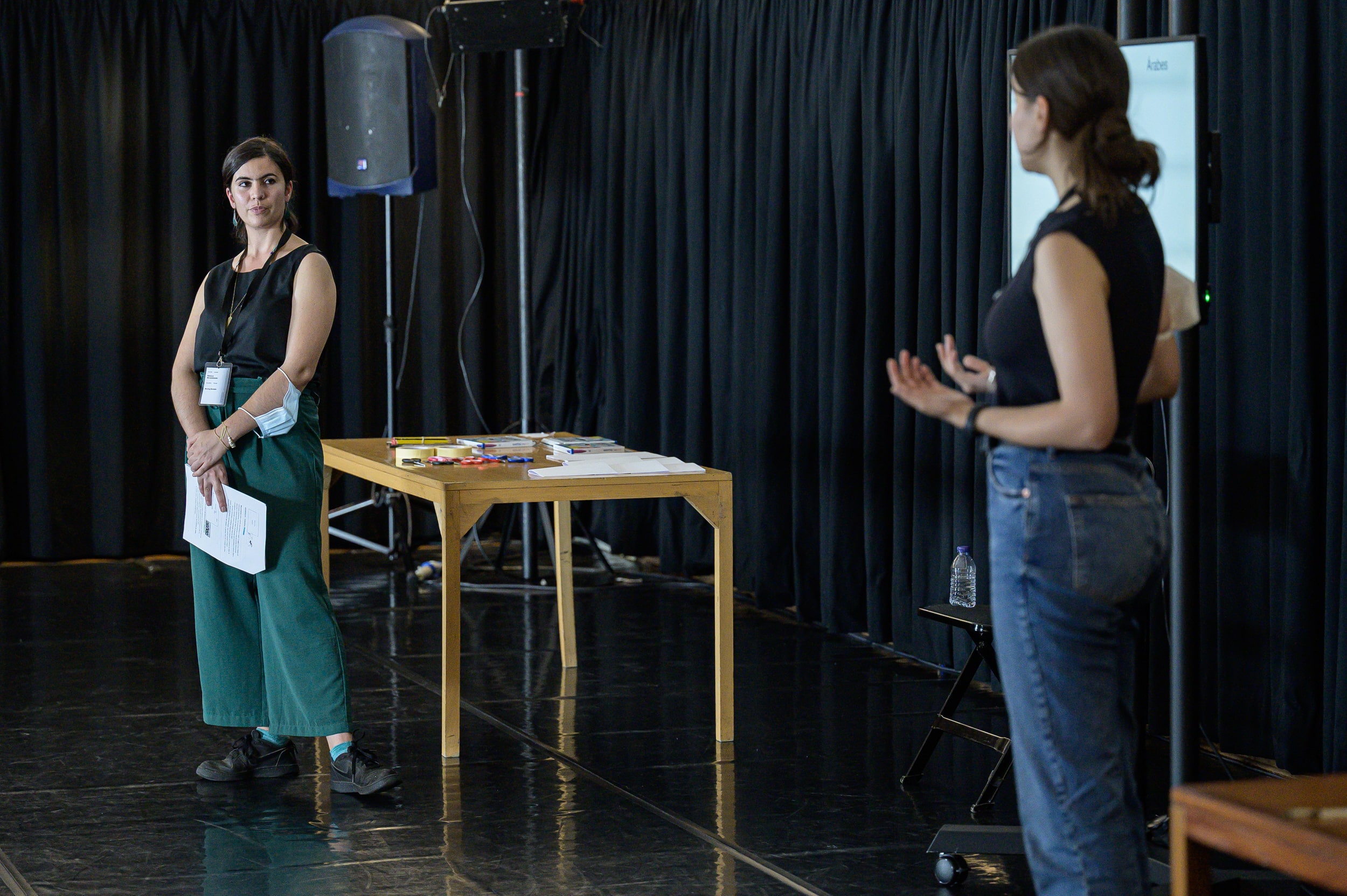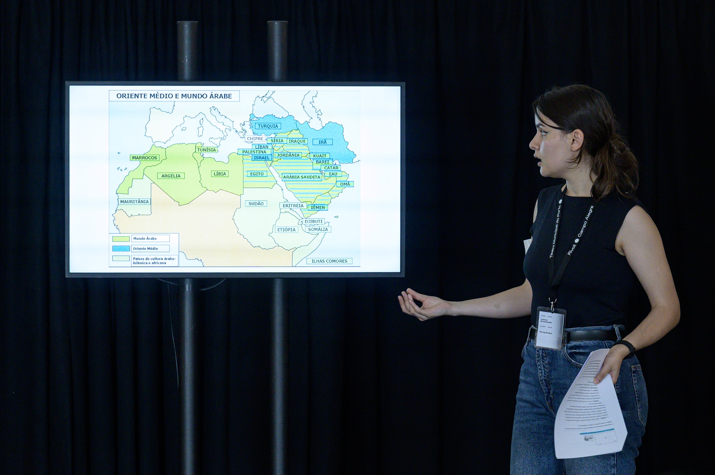 O dia começou pela manhã, na mesquita, num contacto físico e intenso com o espaço de culto do islão no Porto, com a história da religião contada ao vivo por um elemento da direção do Centro Cultural Islâmico do Porto, Mahmoud Soares. Pela tarde, Rebecca e Yasmine deram uma lição de história e cultura muçulmana. Atravessaram séculos, países, etnias, famílias (partindo da sua) e partilharam experiências pessoais (também de xenofobia, típica mas particularmente incompreensível em alguém que se situa entre duas culturas e que quer precisamente contruir pontes, porque se entende como uma). A cartografia que definem tem como estrutura o eixo Batalha-Campanhã, sobre o qual desenham uma linha baseada no bordado iraniano (Pateh), transmitido em descendência feminina. Daqui surgiriam em aula muitas possibilidades de discussão sobre feminismos e sobre os feminismos em contexto de religião, onde estas cartógrafas revelaram sensibilidades particulares, simultaneamente integradoras e fraturantes. Assumido como um projeto artístico em curso, este mapeamento e as suas formas de apresentação evoluirão com a investigação e a prática de Rebecca e Yasmine. Nesta fase, o seu mergulho na cultura levou-as a, por exemplo, experienciar o Ramadão pela primeira vez (de 12 de abril a 12 de maio, deste ano) e a terem de se relacionar com as dificuldades de se limitar a uma primeira refeição nutritiva antes de o sol nascer (sahari) e a tâmaras e água na quebra do jejum depois de o sol se pôr (iftar).